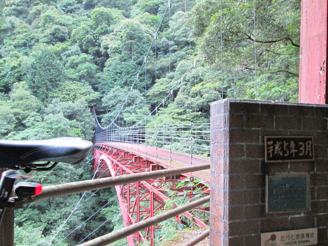 そこを過ぎ、少し進むと赤い鉄橋が見えてきます。これが近代化産業遺産に登録されている「旧遠登志橋」です。この橋の中央から見る景色は何とも言えません。渓谷を流れる水の音と新緑、そして秋には紅葉が川面に映えてとても癒されるポイントです!